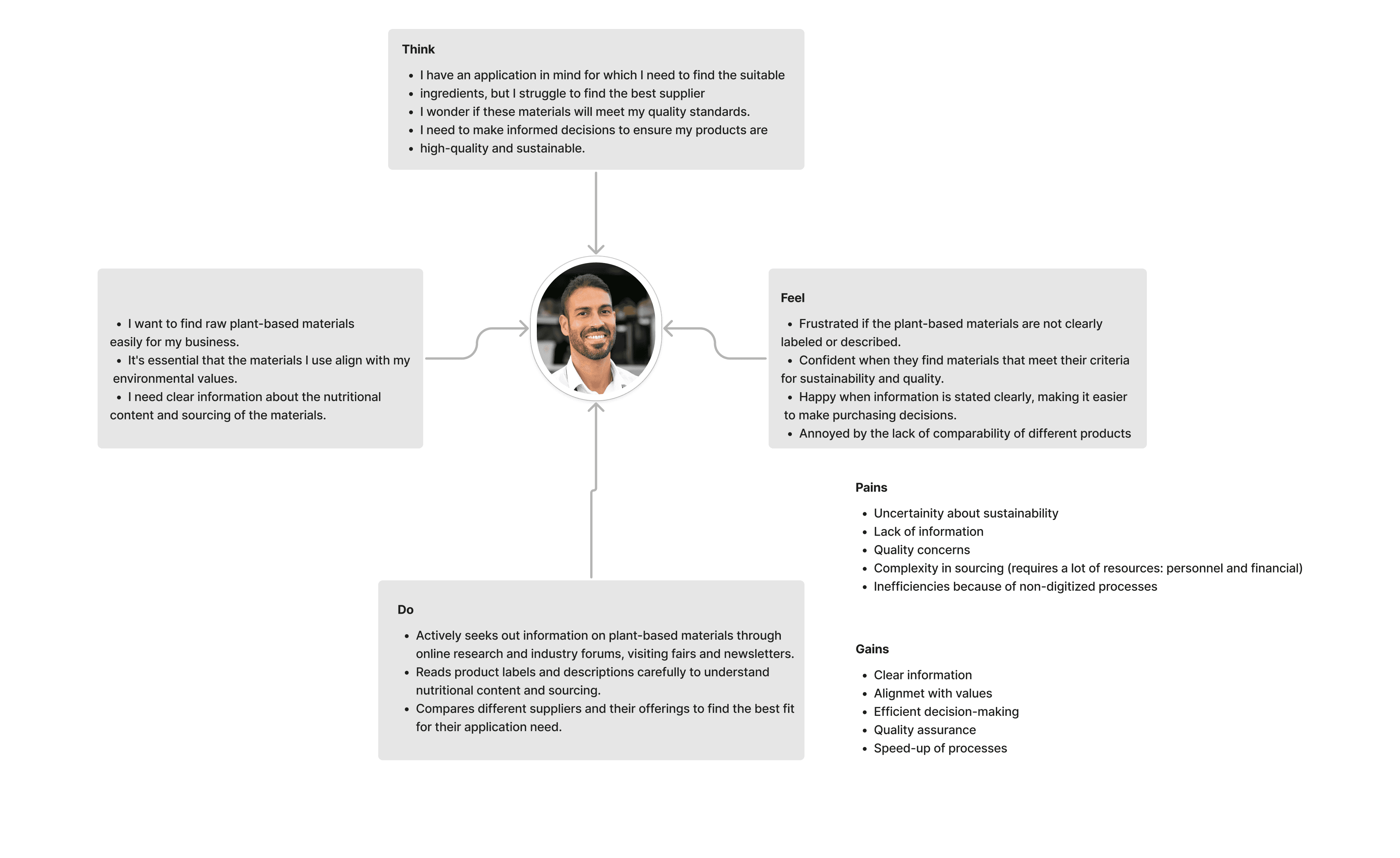 I developed this empathy map to delve deeper into the user experience of Carlos, a persona representing small business owners focused on sustainable sourcing. This empathy map allowed me to capture and categorize Carlos's thoughts, emotions, actions, and pain points, helping me understand his motivations and frustrations on a more personal level. By identifying what Carlos thinks, feels, says, and does, I could align the design more closely with the real challenges and expectations of users in the sustainable food industry.