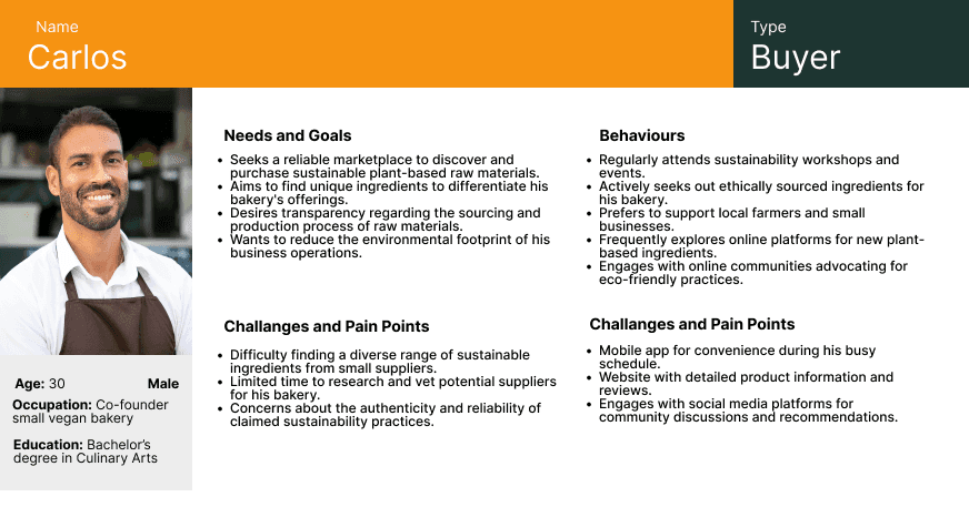 I created the user persona "Carlos" to represent a key segment of my target audience—small business owners in the sustainable food industry. By defining Carlos's needs, goals, behaviors, and pain points, I gained insights into the specific challenges and motivations faced by users in this space. This persona helped me empathize with real users and guided my design decisions, ensuring the final solution would address relevant concerns, such as sourcing transparency, time efficiency, and support for local suppliers.